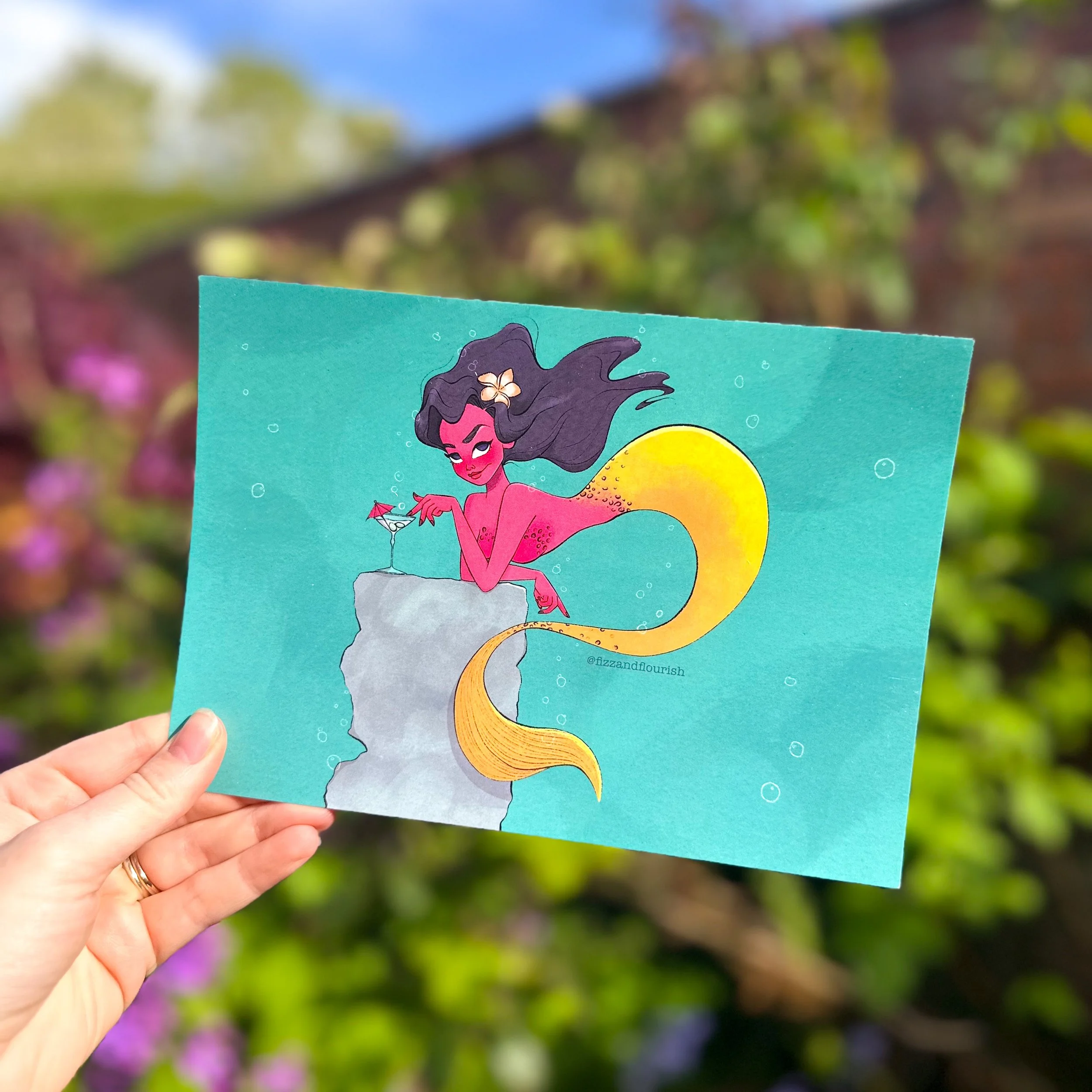 Dive into playful fantasy with this bold and confident mermaid print, originally created for the annual Mermay challenge! This A5 art print features a striking character lounging on a rock, cocktail in hand, with a vibrant yellow tail and cheeky attitude - perfect for ocean dreamers, mermaid lovers, or anyone who enjoys a splash of sass in their decor.